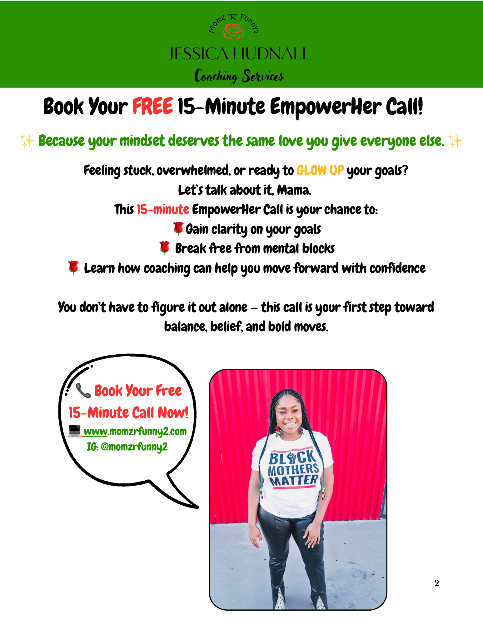 Through my MOMZ “R” FUNNY2 EmpowerHer Coaching Series, I help moms just like you step back into your confidence, reignite your purpose, and find the joy in balancing motherhood, mindset, and money.